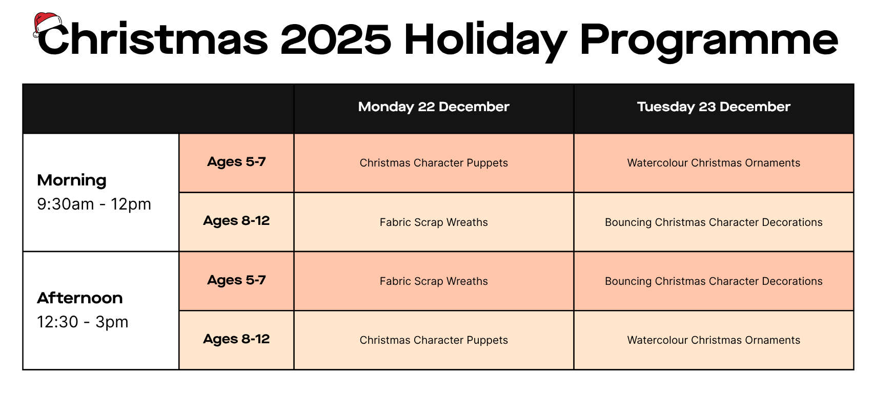 Join us for some fun-filled, Christmas themed arts and craft holiday programme days this December! Led by our wonderful Arts Programme Educator and team, these hands on art activities will embrace festive excitement in the lead up to Christmas. Monday 22 and Tuesday 23 December 9:30am - 3pm | Age groups 5-7 and 8-12